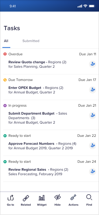 Workflow serves up tasks via notifications in-product or via email, and takes them exactly where they need to go. It provides instructions and action buttons to complete tasks. Once a task is completed, the next person(s) or level of management is notified that the task is ready for their review or approval.